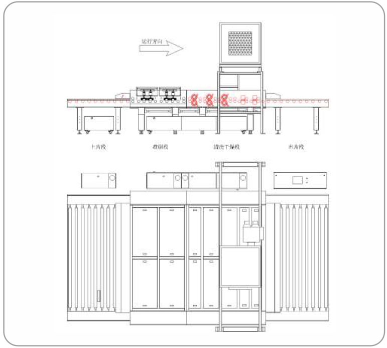 主要由進片段、盤刷段、清洗段、干燥段、出片段組成 。主傳動為軸傳動、變頻器調(diào)節(jié)速度。