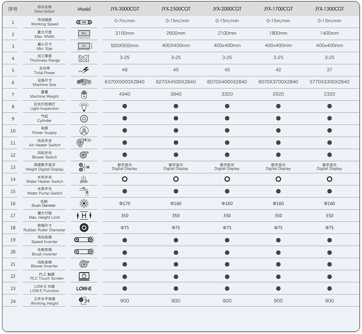 三對大毛刷配置、可洗LOW-E玻璃、普通鍍膜和陽光鍍膜玻璃。